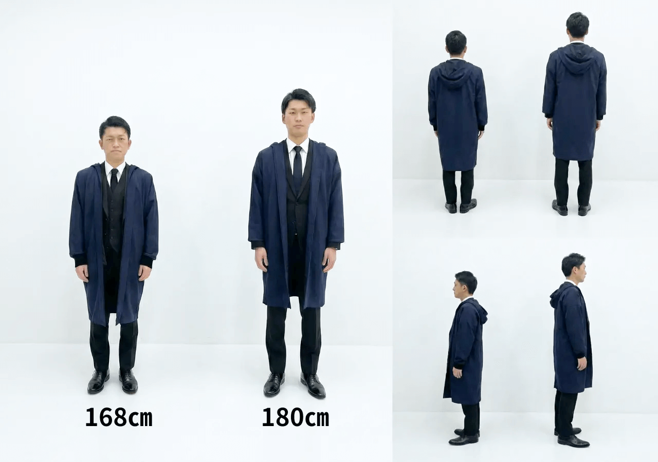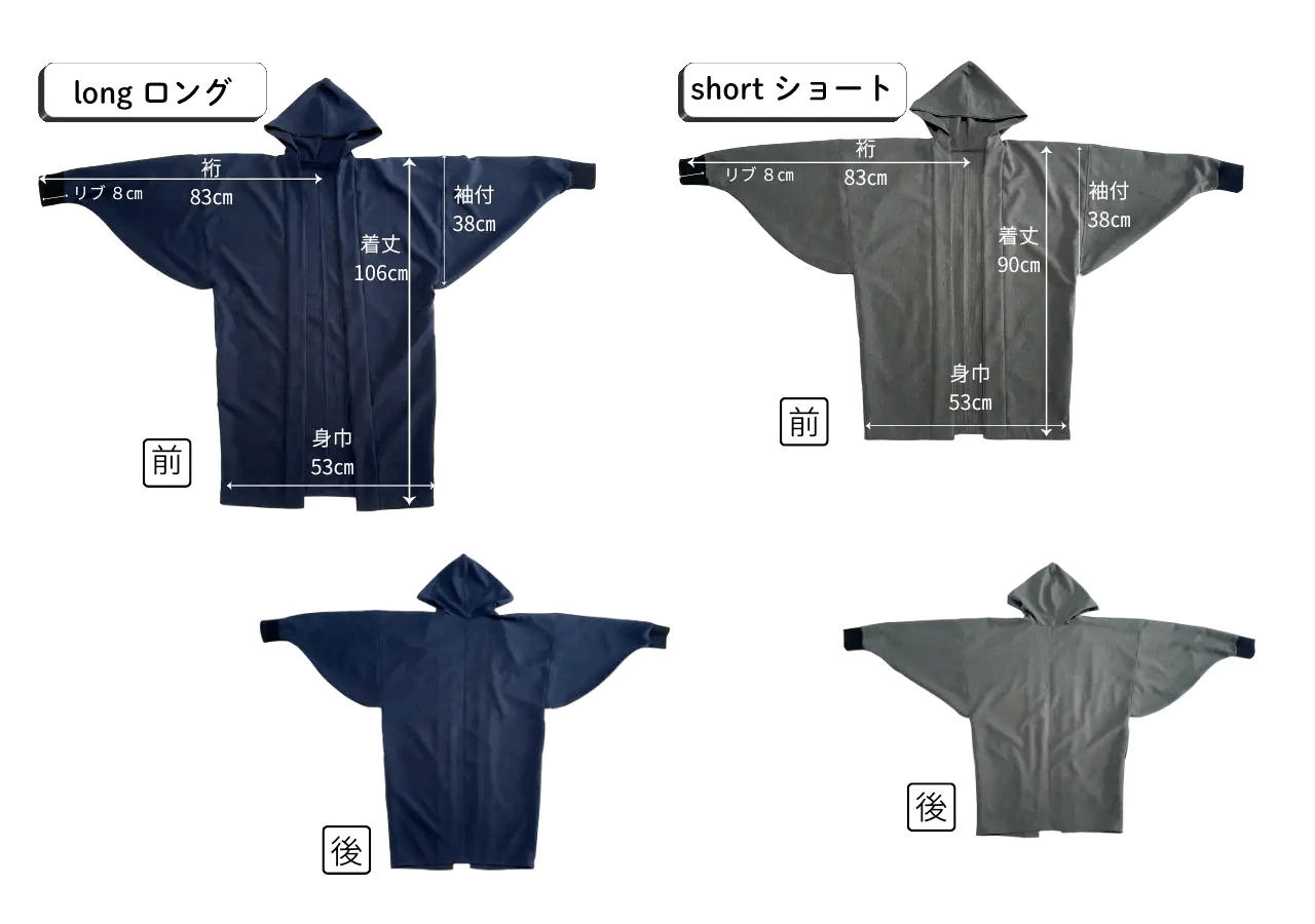 A.基本的には、フリーサイズで和装由来のゆったりとしたシルエットで作られています。肩幅や身幅を、選ばないデザインですので、厚手のニットや、ジャケットの上からでも窮屈感なく羽織っていただけます。長さについてはショート・ロングの2種類からお選びいただけます。(着用例を参考にご覧ください)