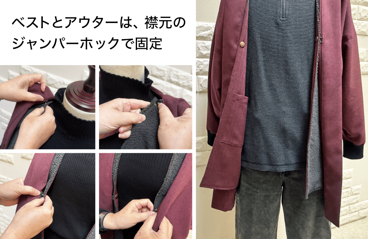 A.襟元に4箇所ジャンパーホックで固定になります。