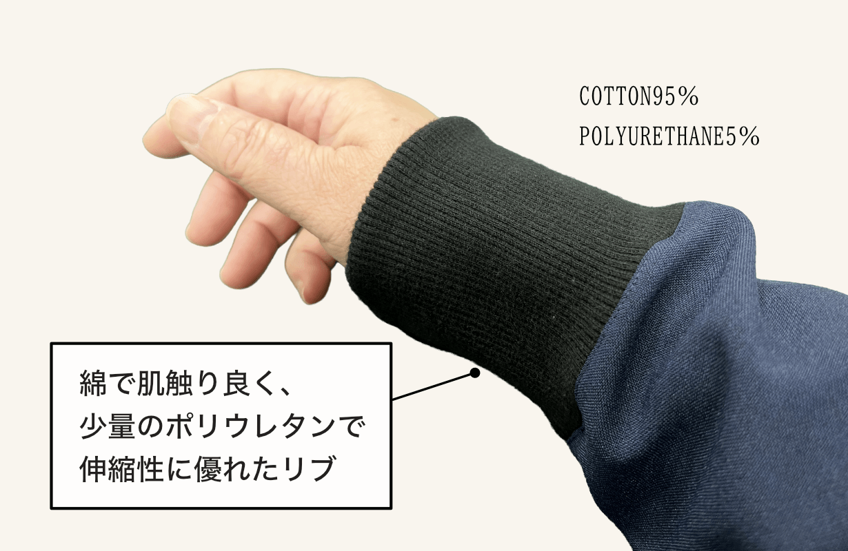 リブ(袖口):スパンテレコ【コットン95%、ポリウレタン5%】
